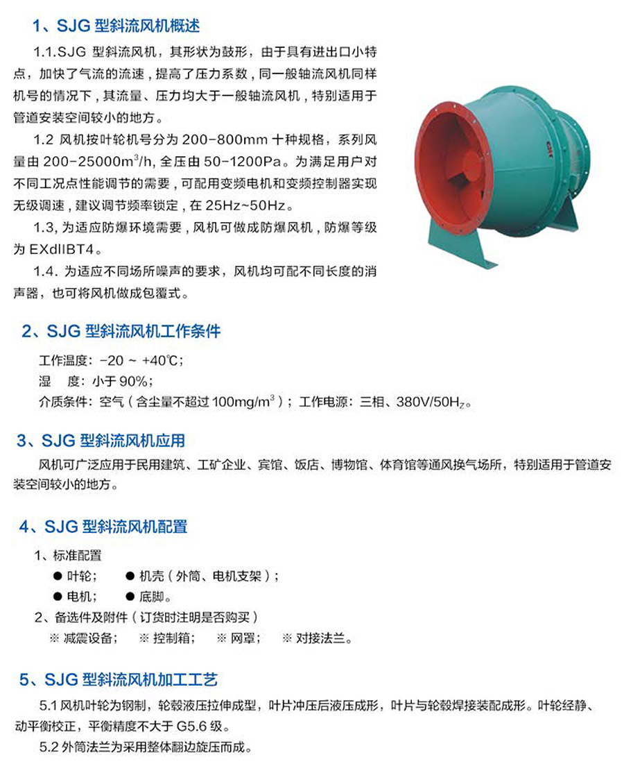 斜流風(fēng)機主要由葉輪、機殼、進(jìn)口集流器、出口導(dǎo)流片、電動機等部件組成。 機殼采用圓筒形、分三段法蘭聯(lián)接成整體,出口進(jìn)口順著氣流聯(lián)接管網(wǎng),進(jìn)口集風(fēng)器制成劍收式流線形,裝有吸音網(wǎng)板組成的整體結(jié)構(gòu),出口裝有導(dǎo)流片,使出口氣流有良好的氣流分布,穩(wěn)定的壓力持性。