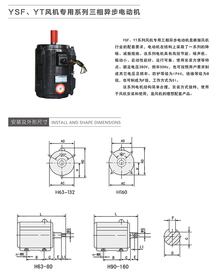 YT系列風機專用三相異步電動機是根據(jù)風機行業(yè)的配套要求,電動機在結(jié)構(gòu)上采取了一系列的降噪、減振措施。該系列電機具有高效節(jié)能、噪聲低、振動小、起動性能好、運行可靠、使用安裝方便等特點。額定電壓380V、頻率50HZ,也可按用戶要求制成其它電壓及頻率。防護等級為IP44,絕緣等級為B級,也可制為F級,工作方式為S1。 該系列電機結(jié)構(gòu)簡單合理,安裝方式好,適用于風機安裝和使用,是風機的理想配套產(chǎn)品。